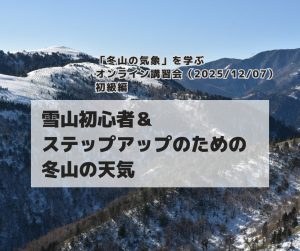 | 12/1(日) | 第七回 「冬山の天気」 | 初級編「雪山初心者のための冬山の天気」 中級編「天気図で読む!冬山気象遭難を防ぐ方法」 有料配信: [2024/12/01収録] 「冬山の気象」を学ぶオンライン講習会の有料配信を開始しました |